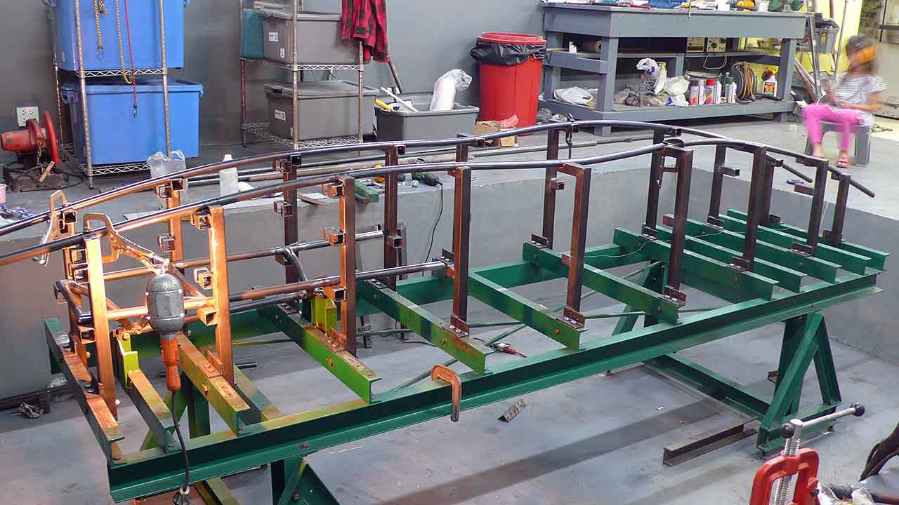 P1090231 Published December 4, 2011 at 1280 × 720 in By the Pricking of My Thumbs, Something Wicked This Way Comes ← Previous Next → Both top frame tubes bent to shape and matched to each other, in place on the chassis jigs Both top frame tubes bent to shape and matched to each other, in place on the chassis jigs