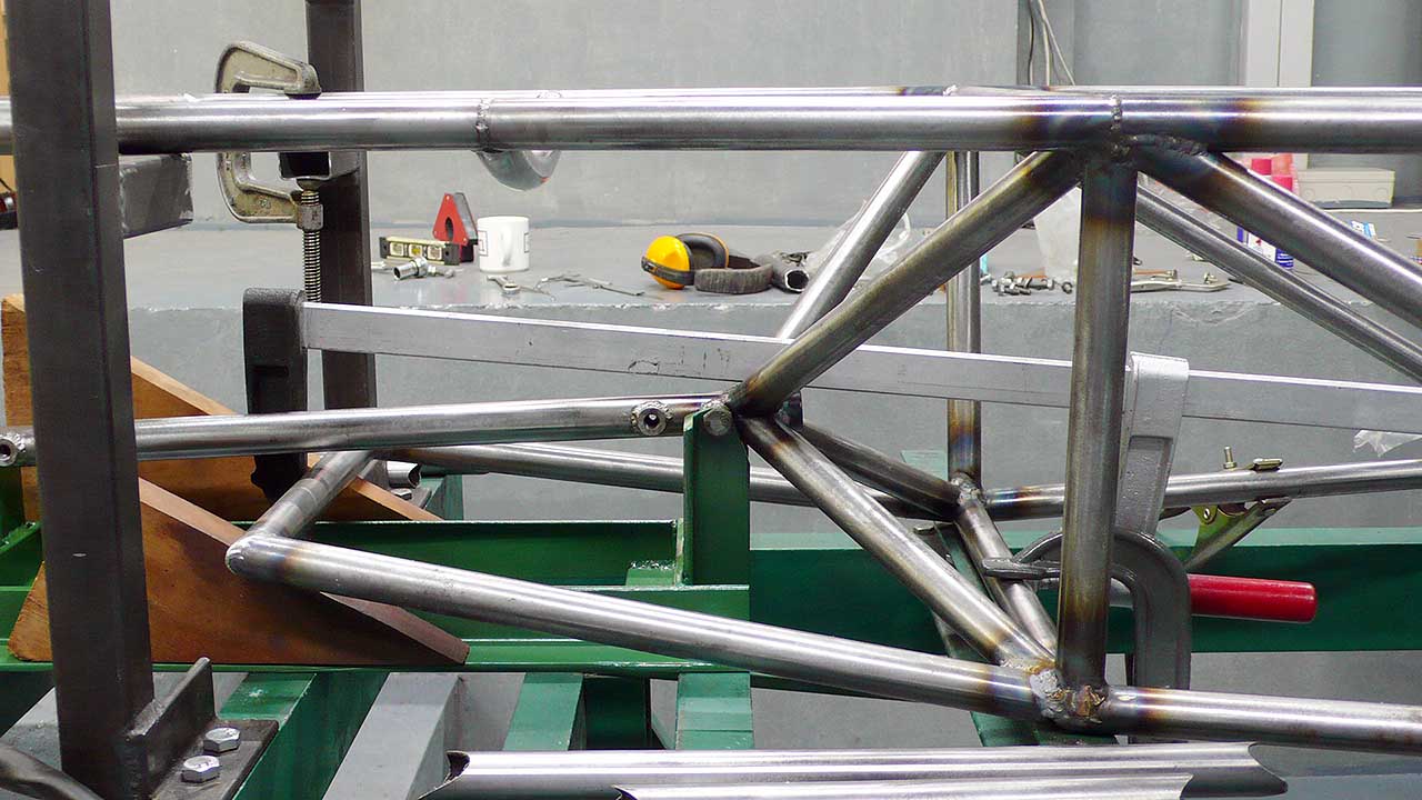 P1090646 Published March 8, 2012 at 1280 × 720 in Building the Frame: Roll Hoop to Tail ← Previous Next → H-J bottom perimeter tubes in place. These 3 tubes were welded flat on the table then lifted into place. Here you see the bottom of the car start to curve upward to clear the diffuser. race car tube frame fabrication rear diffuser clearance