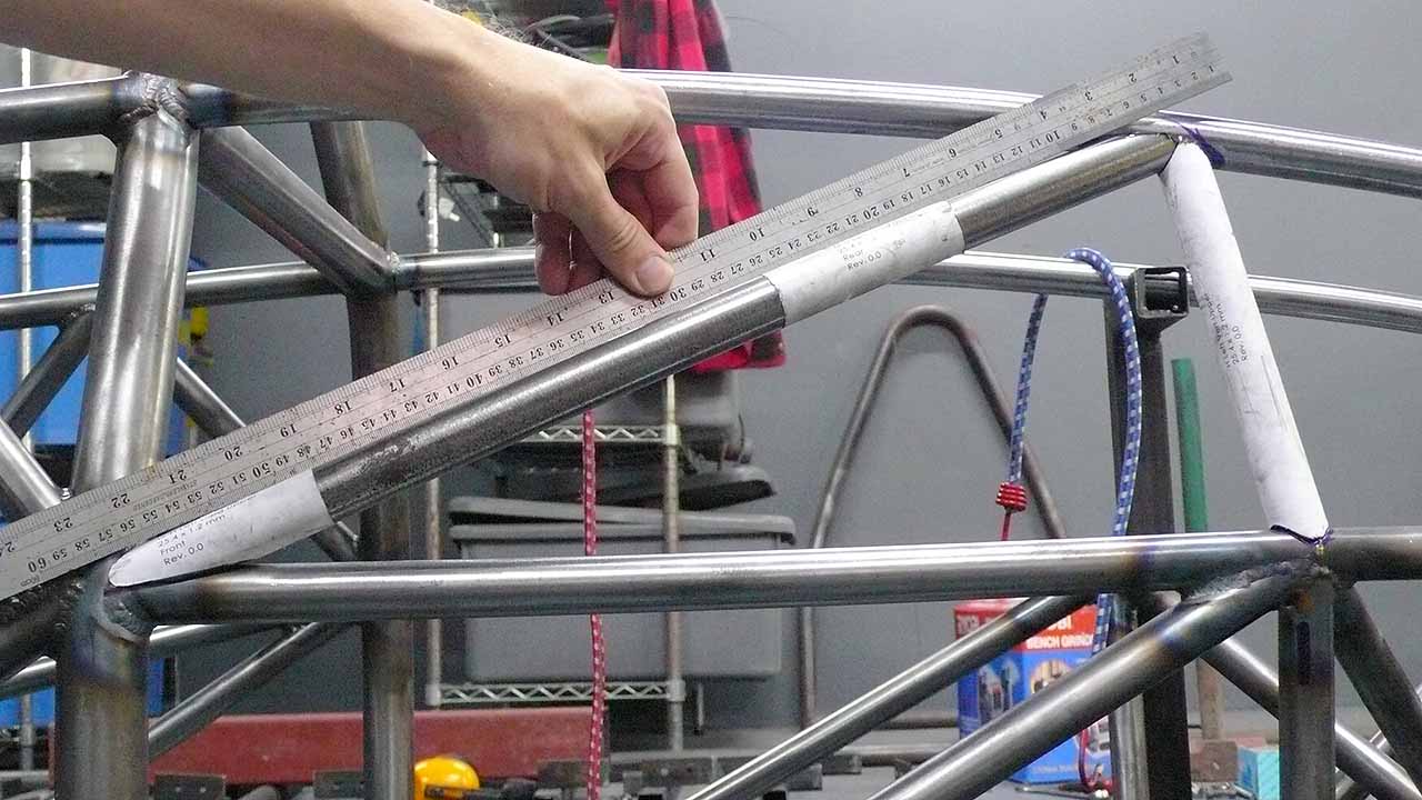 P1090680 Published March 8, 2012 at 1280 × 720 in Building the Frame: Roll Hoop to Tail ← Previous Next → G-H upper diagonals are curved outwards to allow us to remove the engine from the top. The curve must be in the correct plane.