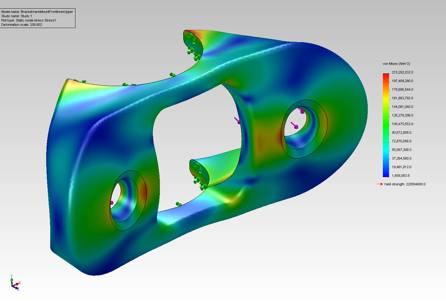 BracketAarmMountFrontInnerUpperStress1.analysis Published April 14, 2012 at 1448 × 989 in Redesigning Suspension Components ← Previous Next → FEA plot for front upper suspension attachment bracket that will be welded to the chassis. FEA finite element analysis result plot for upper front suspension attachment bracket