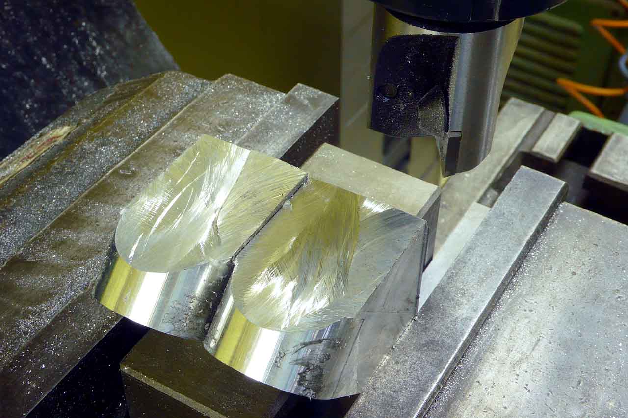 45-degree faces are rough cut with the angle grinder, then clevises are supported on V-blocks clamped to the milling machine.