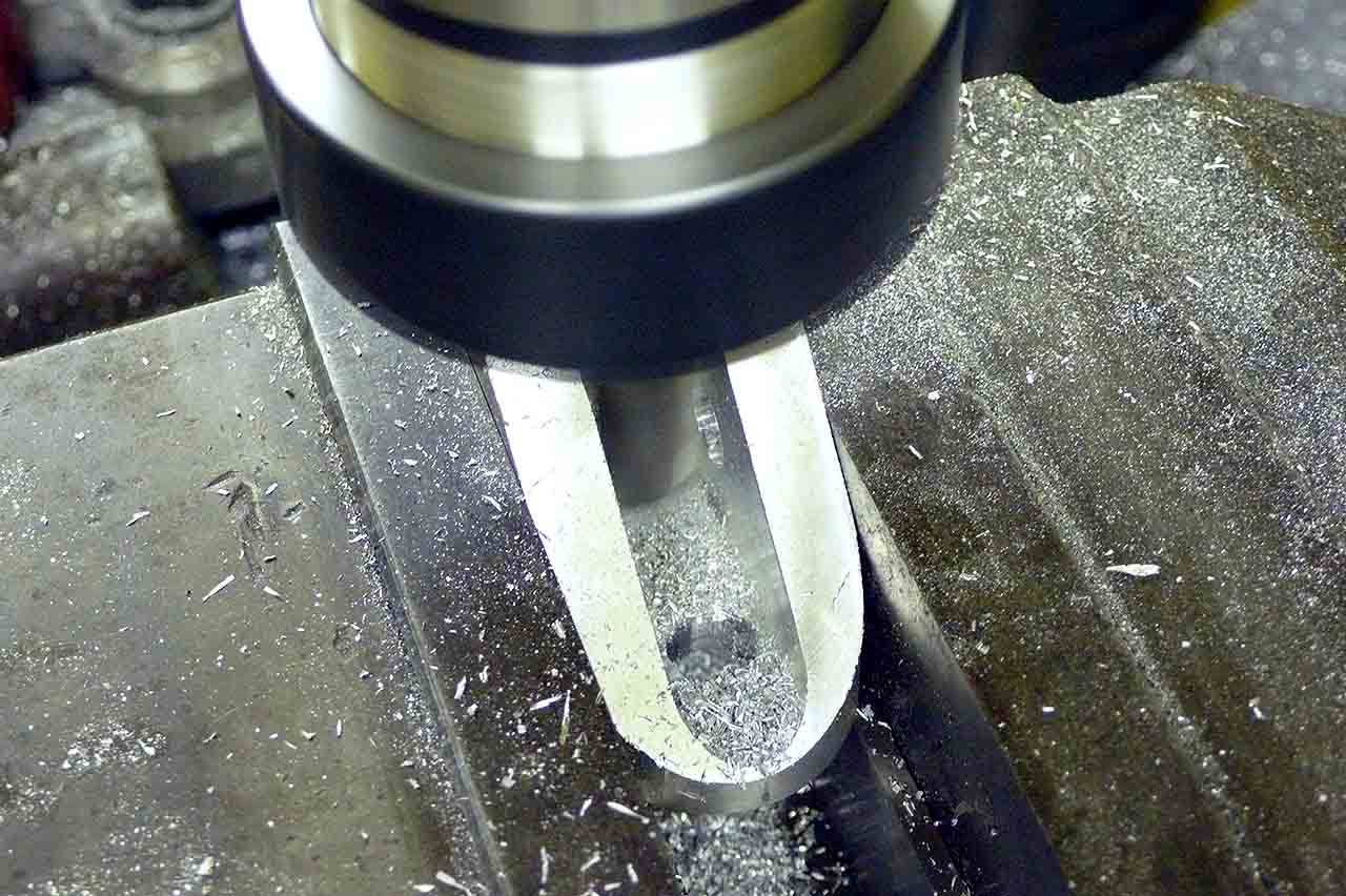 Milling an additional relief for the rod ends. Test assembly showed interference, so I went back to the computer model and, sure enough, there it was. Now I know to use the interference and clearance detection tools.