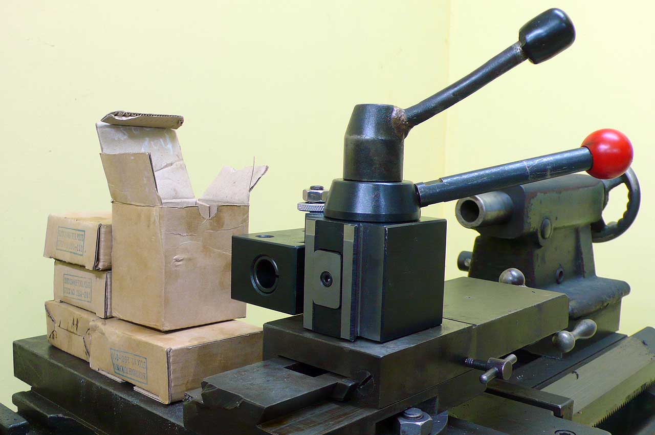 Aloris quick-change toolpost in place on lathe after modification, a selection of quick-change toolholders in boxes in background.