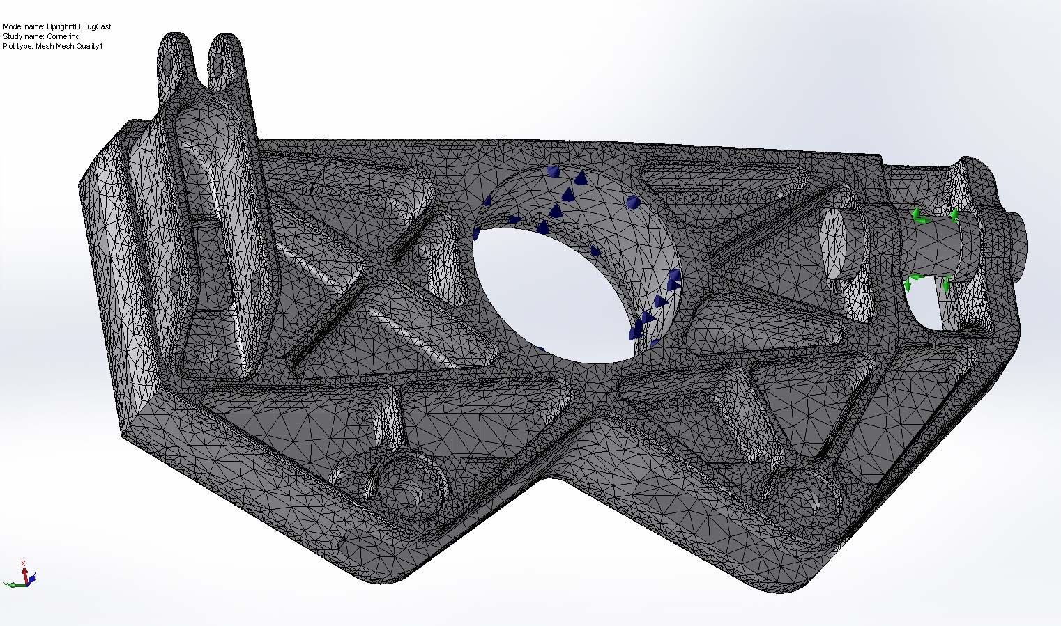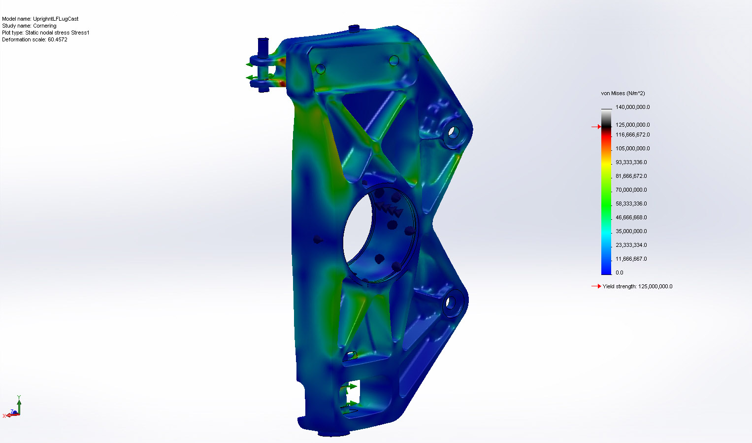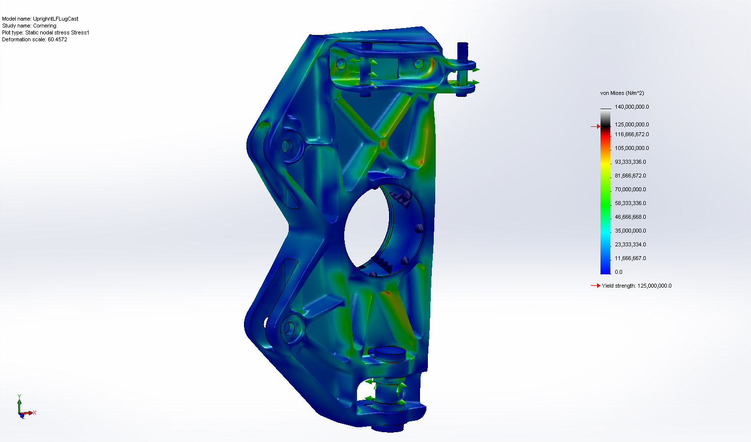 Setting up FEA simulations in Solidworks is easy. I think, starting from scratch, I could do the basics in less than a minute. The places where you typically get hung up would be inadequately restraining the model, or having it fail to mesh. For some parts you have to spend a fair amount of time thinking about the proper combination of restraints and applied loads. If it fails to mesh, just take the meshing slider and jam it over to the finest setting, and that usually fixes the problem. If not, you’ll probably find a sharp edge or highly acute angle in the model. For the upright, I have several different simulations setup: one for braking, one for cornering, one to test the bearing snap ring, and so on.
