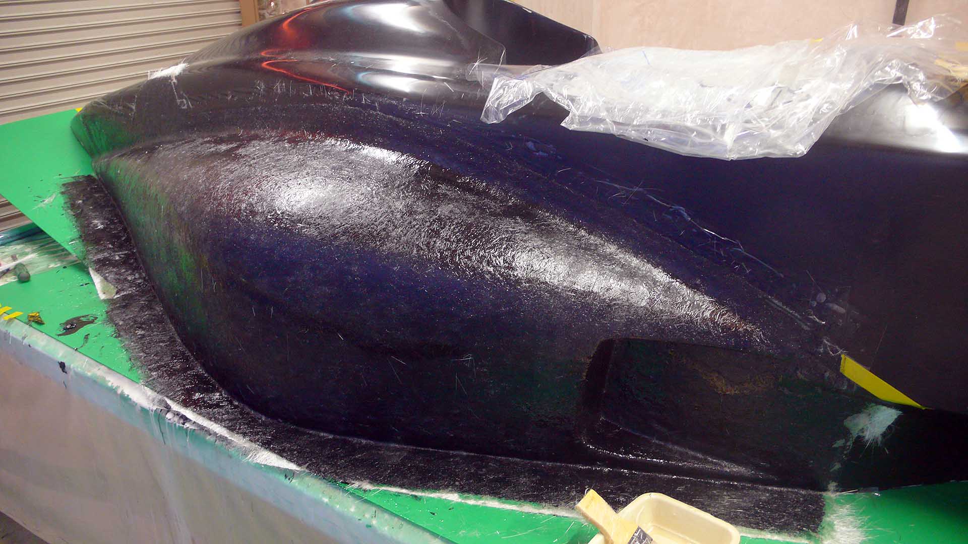 P1120046 Published November 28, 2013 at 1920 × 1080 in Fiberglass Mold Making- Nose, Tail, Sidepod ← Previous Next → Fiberglass “lock layer” applied over gelcoat fiberglass mold layup of race car sidepod; lock layer over gelcoat
