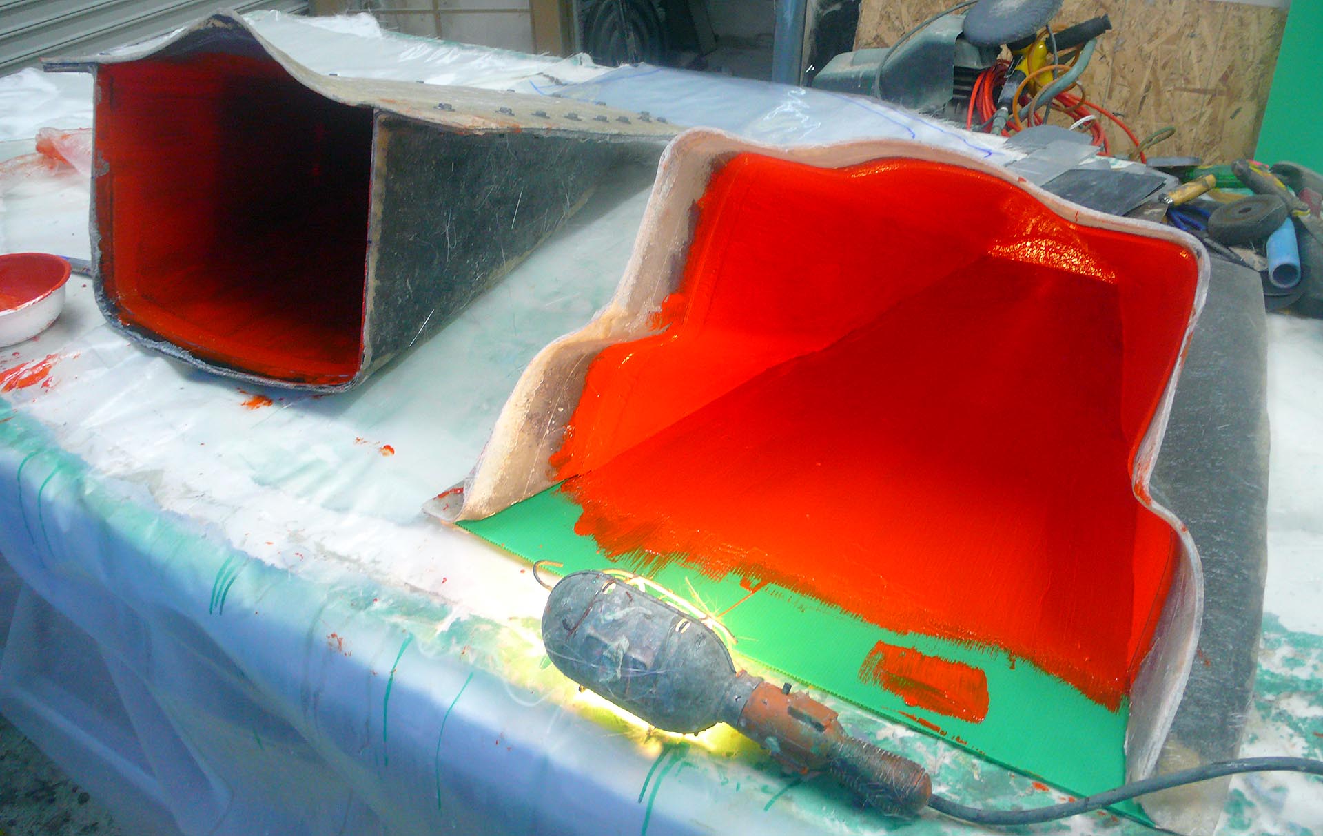 P1120227 Published January 10, 2014 at 1920 × 1214 in Part Eleventy-seven, In Which We Finally Lay Up a Body ← Previous Next → Nose and tail molds gelcoated Formula 1000 race car fiberglass body panel layup fabrication molding