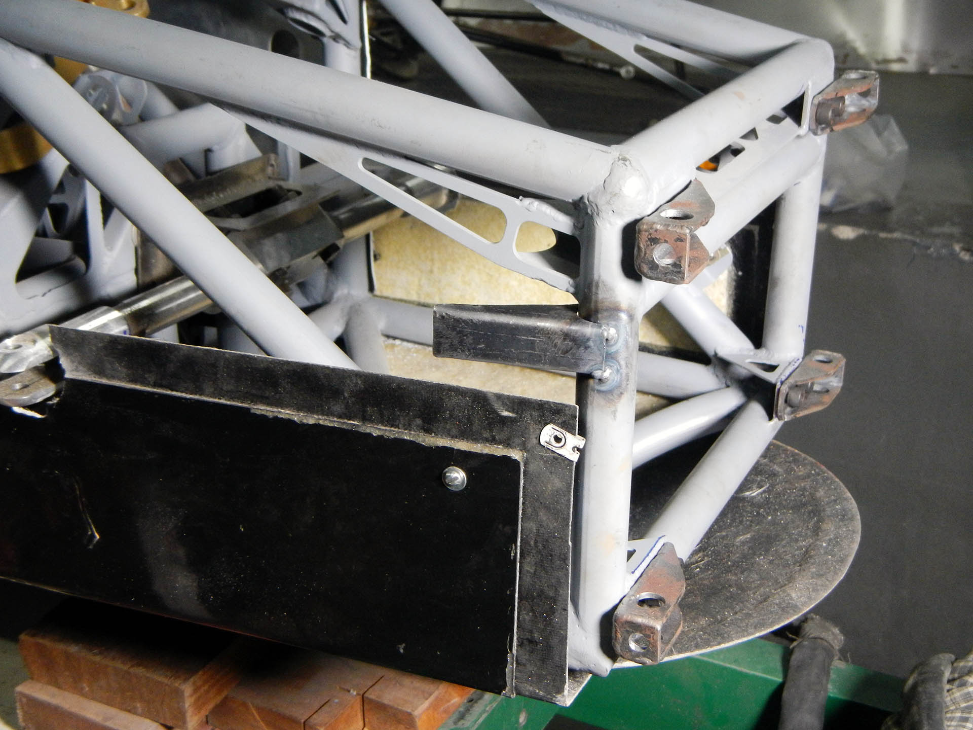 DSCN3397 Published November 18, 2014 at 1920 × 1440 in Attaching the Body ← Previous Next → A view of the keel, leg cover and nose mounts Mounting the body on a formula 1000 race car; keel, leg cover and nose mounts