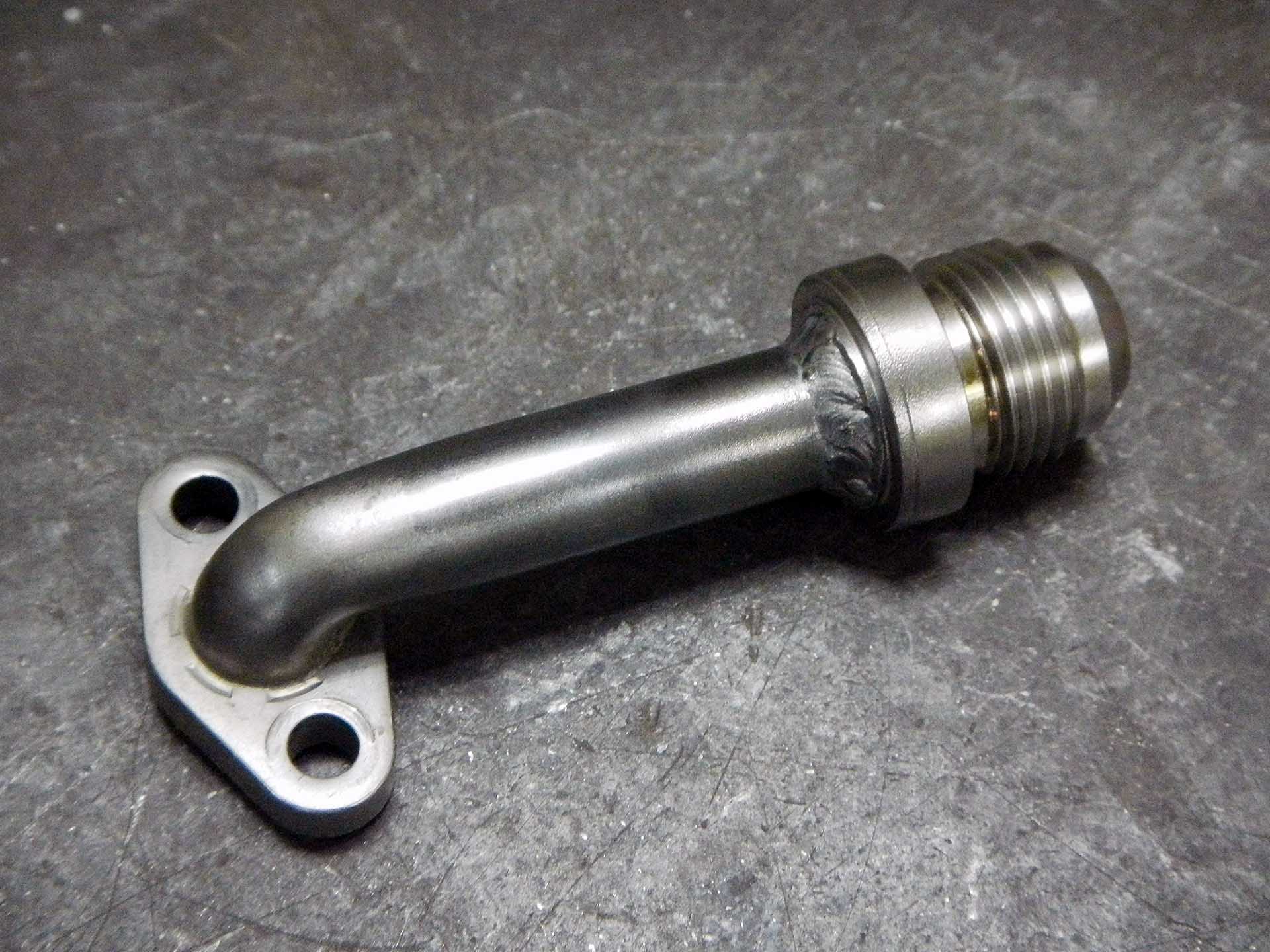 DSCN3987 Published August 14, 2015 at 1920 × 1440 in Plumbing the Oil Cooler ← Previous Next → AN-10 adapter welded to left side oil line fitting. Suzuki GSX-R1000 oil return line adapted to AN-10 hose.
