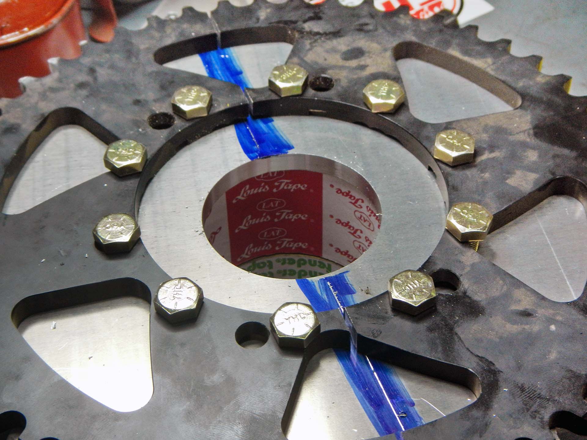 DSCN4330 Published August 15, 2015 at 1920 × 1440 in Completing the Chain Tensioner, Rear Sprocket & Shift Linkage Test-fitting new rear sprocket to old one as it can’t be mounted until cut in half.