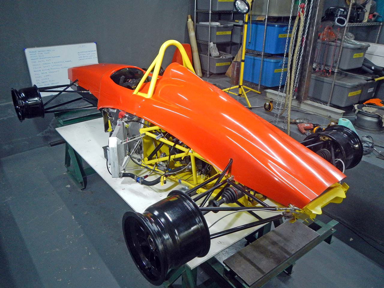 The car uses an OEM Suzuki GSX-R1000 fuel pump mounted in an external swirl pot. The swirl pot is fed by another electric fuel pump that draws from the fuel cell, with excess fuel returned to the fuel cell. The swirl pot will generally be full, providing a buffer in case the pickup in the fuel cell temporarily sucks air during hard cornering or braking. The shape of the swirl pot is tall and narrow, with the fuel drawn from the bottom so that the engine should never experience fuel starvation.