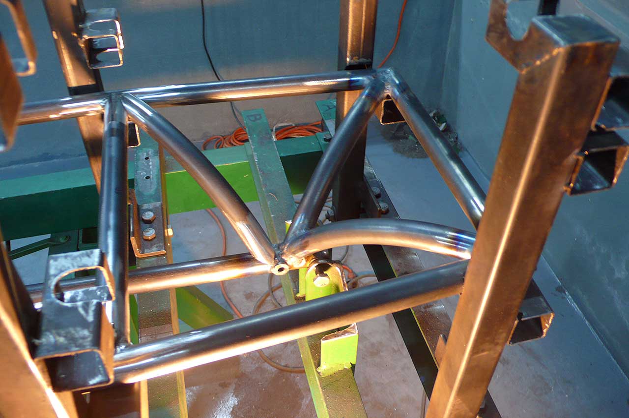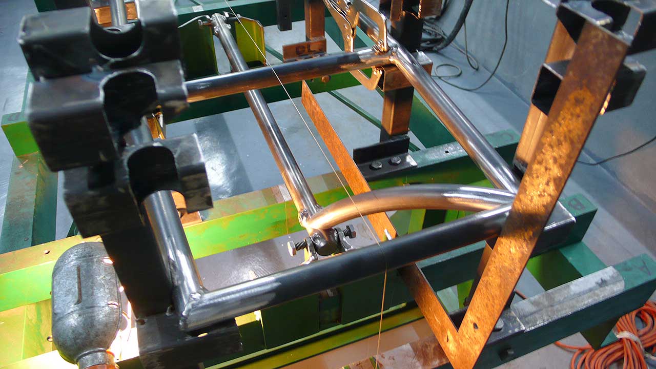 Both top frame tubes bent to shape and matched to each other, in place on the chassis jigs. Now it's possible to get a feel for the size and shape of the car. It's really going to be beautiful!